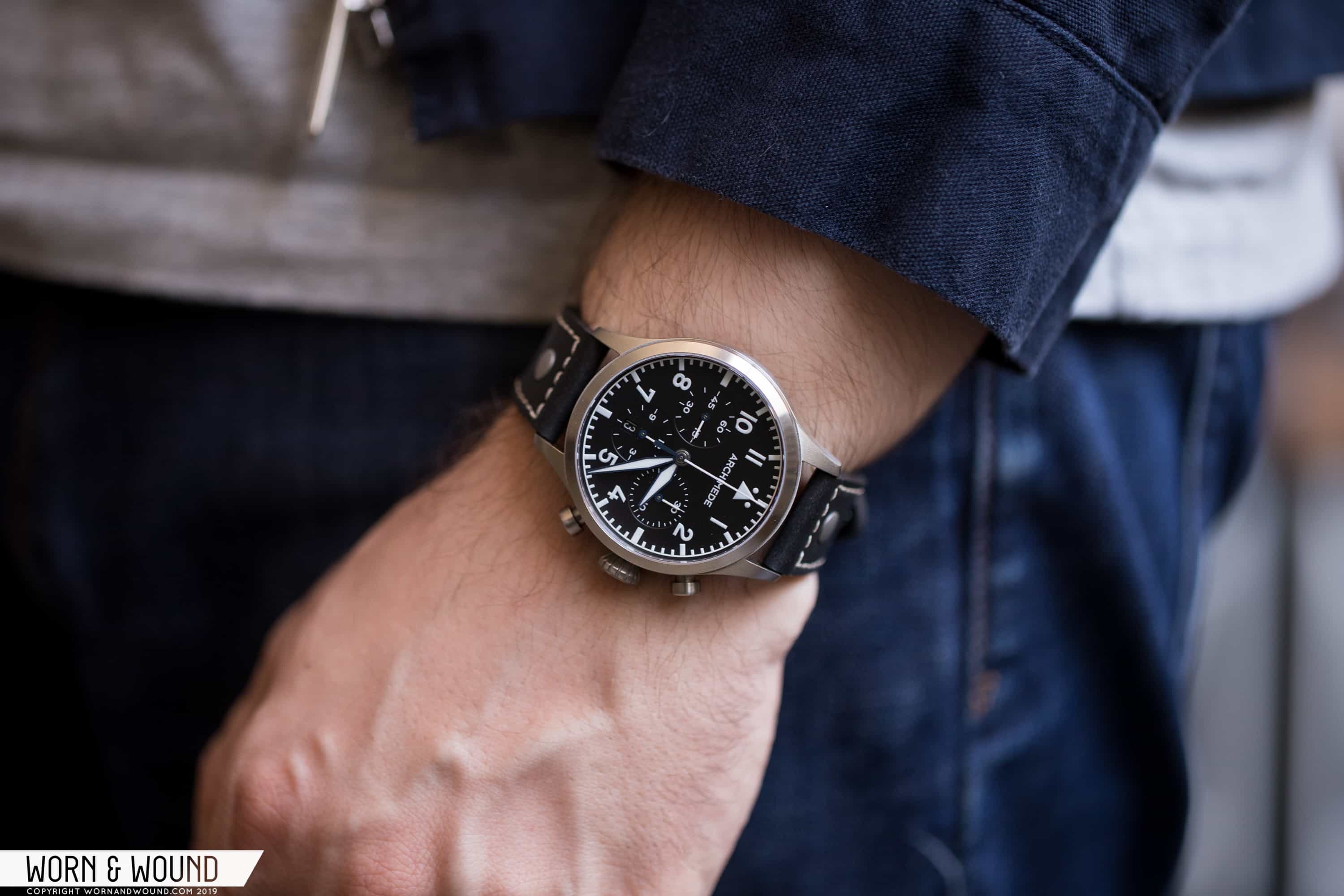 Inspirée des montres pilotes américaines WWII de Hamilton. Excellent rapport qualité-prix. |